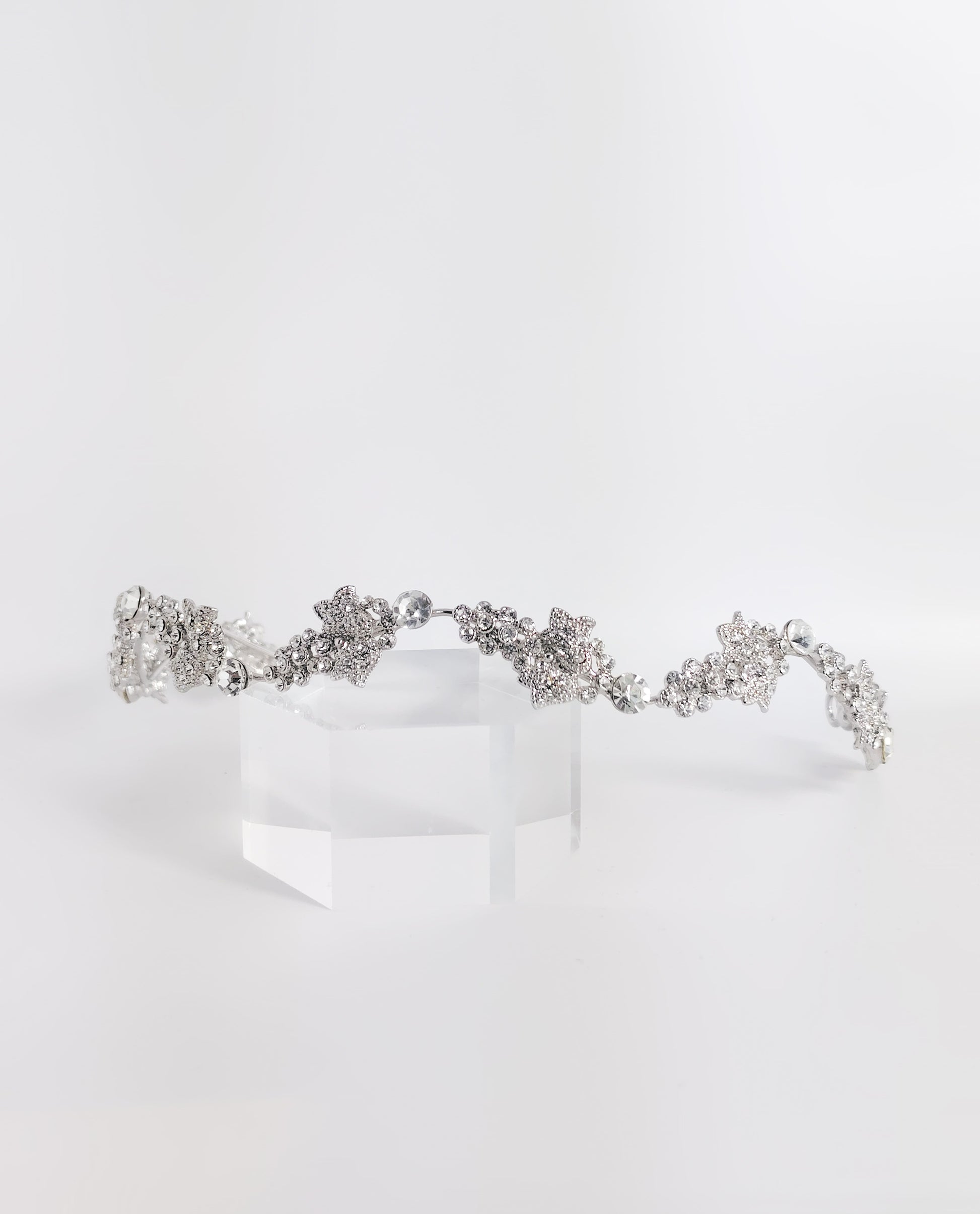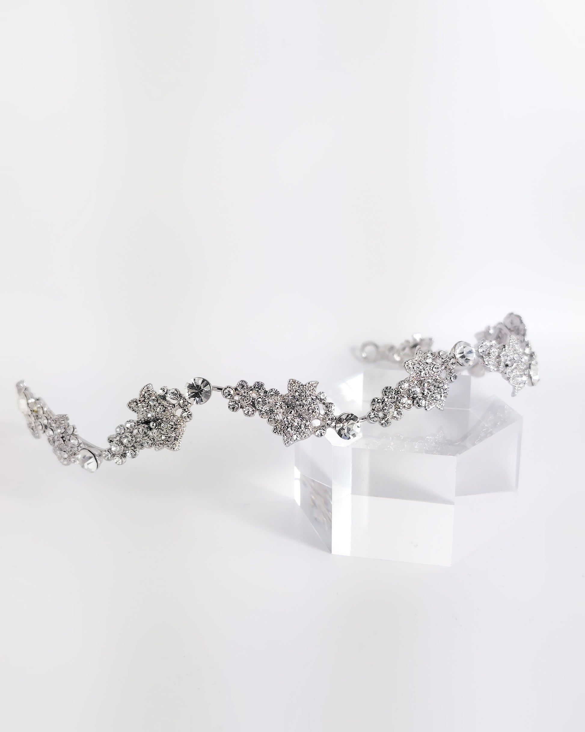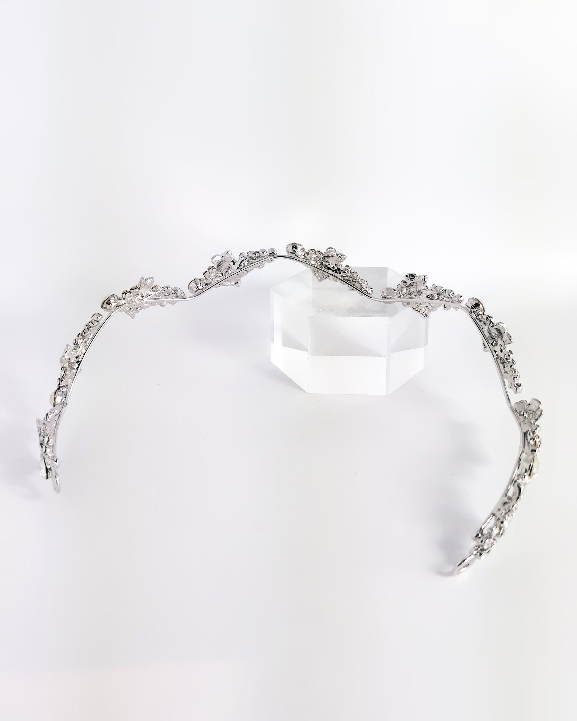 細やかな花のモチーフが連なり、やさしい光沢を放つカチューシャ。シルバーのベースが肌なじみよく、顔まわりを明るく見せてくれます。控えめな輝きがナチュラルな雰囲気を引き立て、ブライダルやパーティーシーンにぴったり。