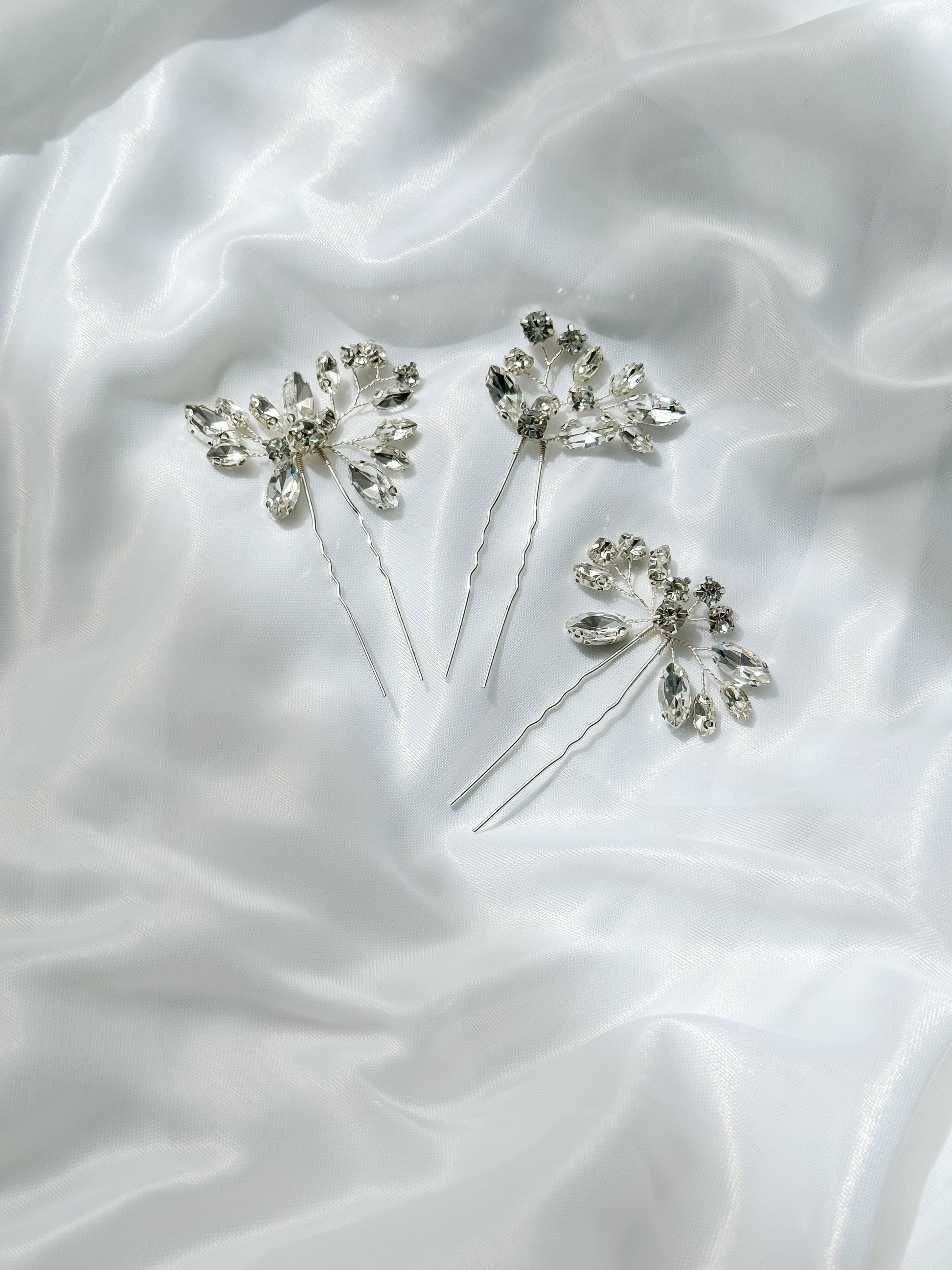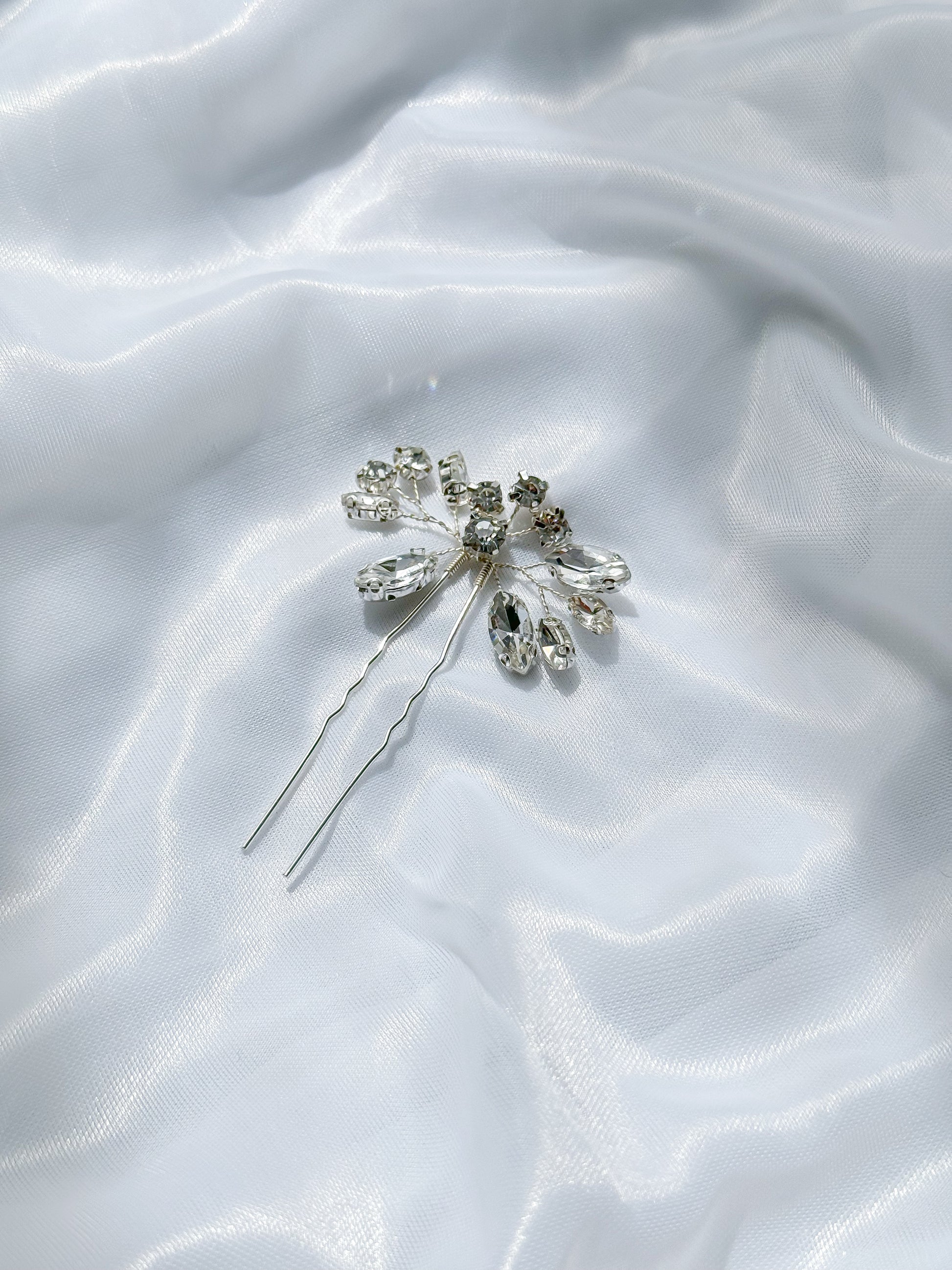 様々な形のビジューが組み合わされたヘアピンセット。ナチュラルなヘアスタイルも上品に見せてくれます。